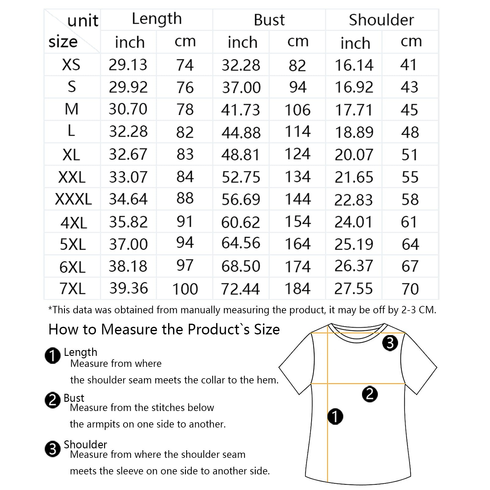 The measurement data of this size is obtained by laying clothes flat. Due to different measurement methods, it is normal that the error is within 2-3cm.