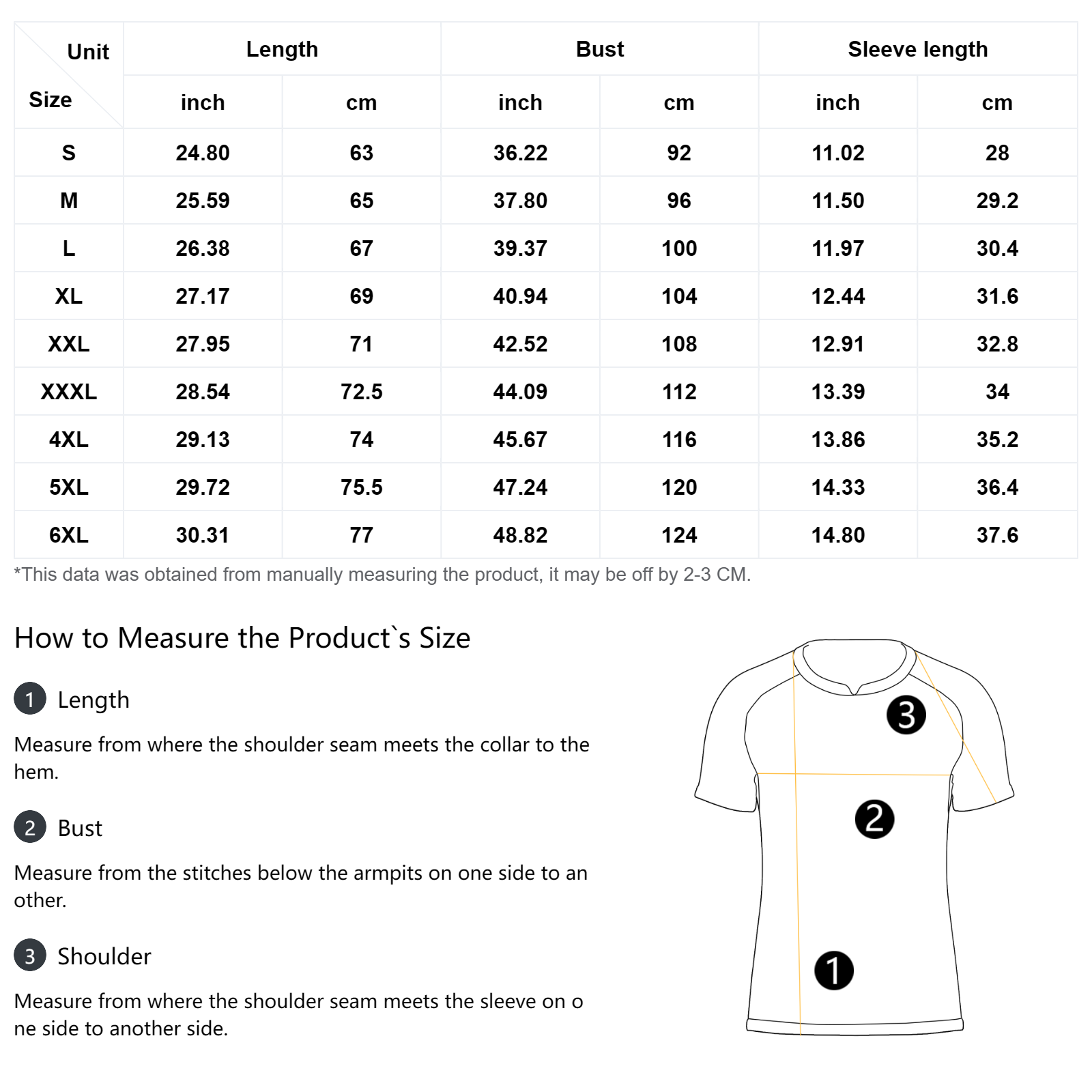 The measurement data of this size is obtained by laying clothes flat. Due to different measurement methods, it is normal that the error is within 2-3cm.