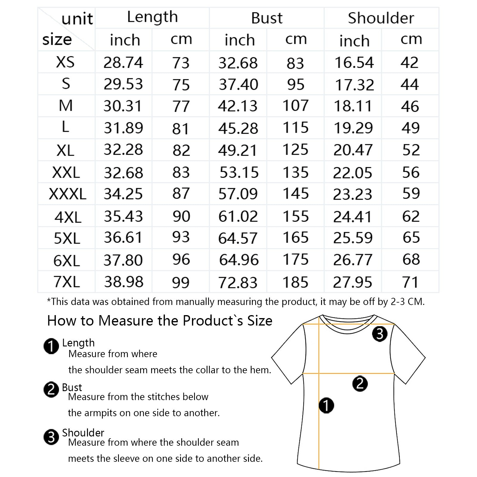 The measurement data of this size is obtained by laying clothes flat. Due to different measurement methods, it is normal that the error is within 2-3cm.